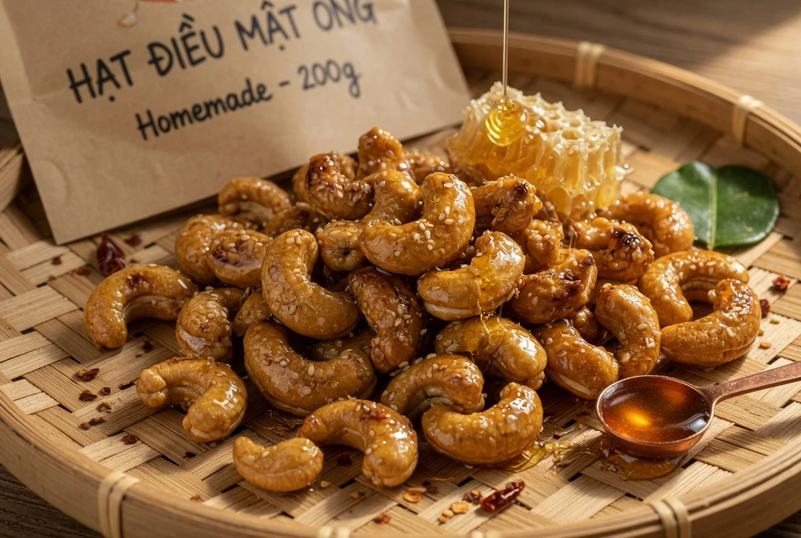 Về nền tảng dinh dưỡng, hạt điều thường được biết đến là thực phẩm chứa chất béo không bão hòa, protein thực vật cùng một số khoáng chất như magie, kẽm, đồng. Đây là lý do hạt điều thường xuất hiện trong nhóm hạt điều dinh dưỡng hoặc các món ăn vặt healthy khi dùng với lượng hợp lý. Mật ong trong món này chủ yếu góp phần tạo mùi thơm đặc trưng và vị ngọt dịu hơn so với nhiều loại đường tinh luyện trong cảm nhận vị giác. Một số bài viết về chủ đề này cũng nhấn mạnh mật ong có chứa các hợp chất chống oxy hóa, nhưng điều đó không có nghĩa là món ăn nên được xem như thực phẩm “thần kỳ”. Cách nhìn hợp lý hơn là: đây là món snack ngon, có giá trị dinh dưỡng nhất định, phù hợp khi ăn điều độ.